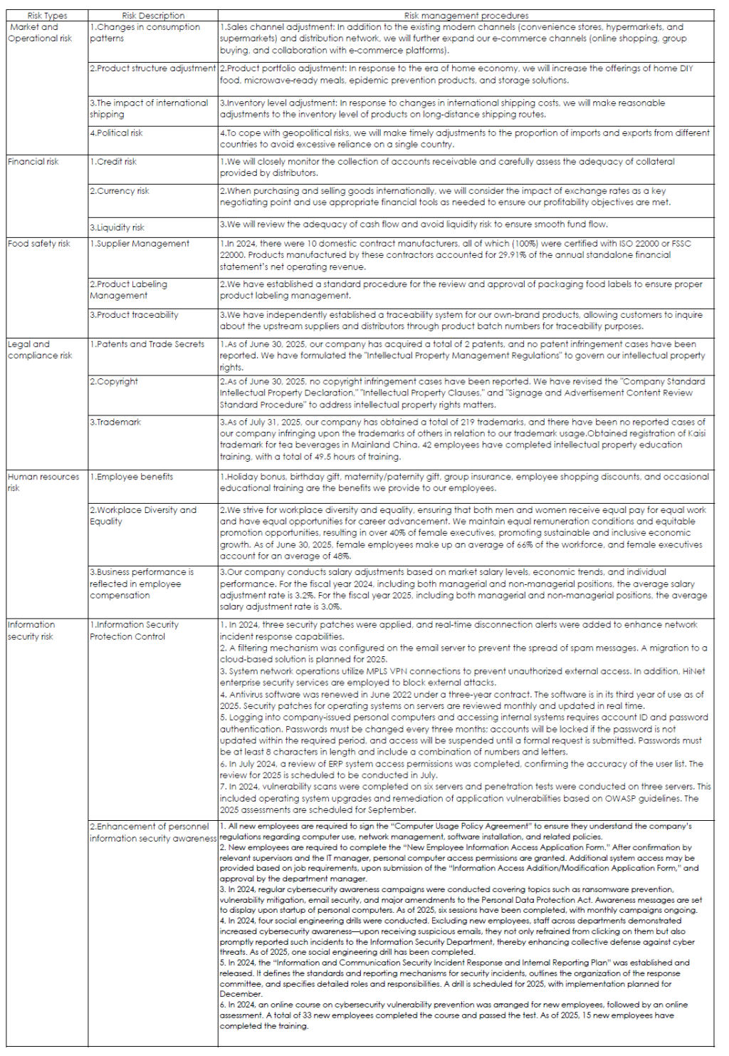 The Company should review its business and operational characteristics and incorporate the following risk types into its management: i) market risk; ii) operational risk; iii) financial risk; iv) food safety risk; v) legal compliance risk; vi) human resources risk; vii) information security risk; viii) other risks.